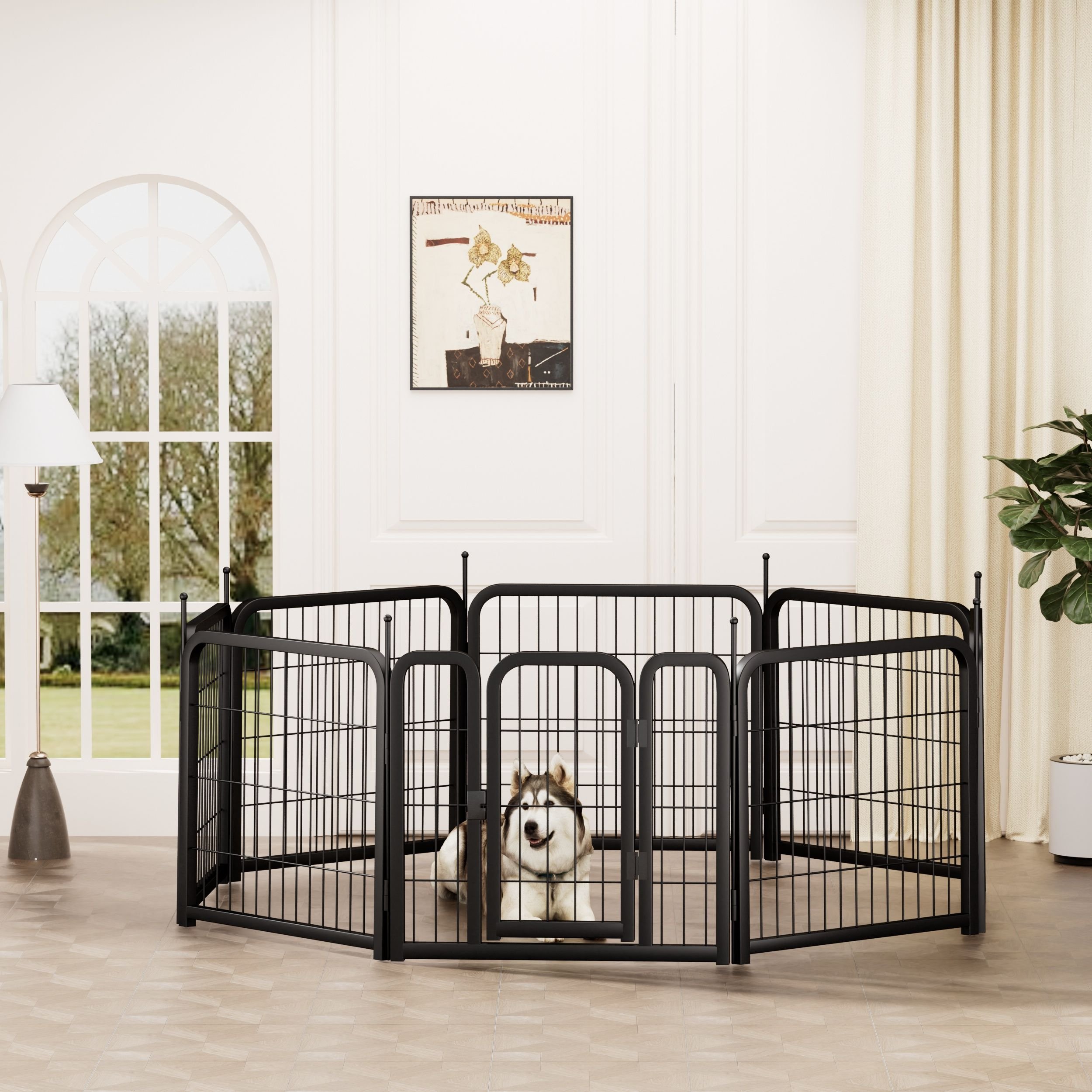 Multi-scenario use: The outdoor powder coating keeps them from rusting, which makes it ideal for RV camping, traveling, or for use in the yard. Can be assembled into a variety of shapes and sizes, including square and rectangular, adding or removing panels as needed to achieve the desired shape. For indoor use, we recommend placing it on a dog mat or rug to prevent the bars from scratching the floor.